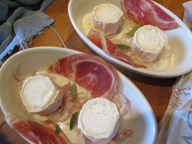 - 1 goat cheese/chevre, “log”shape (in the hot oven, the outer “skin” allows them to hold their shape as the cheese melts inside.)
