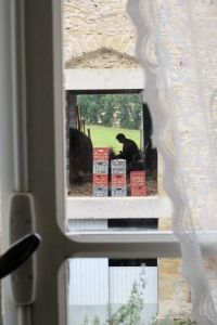 Through the window of the kitchen across the courtyard there’s a young woman working upstairs in the barn.