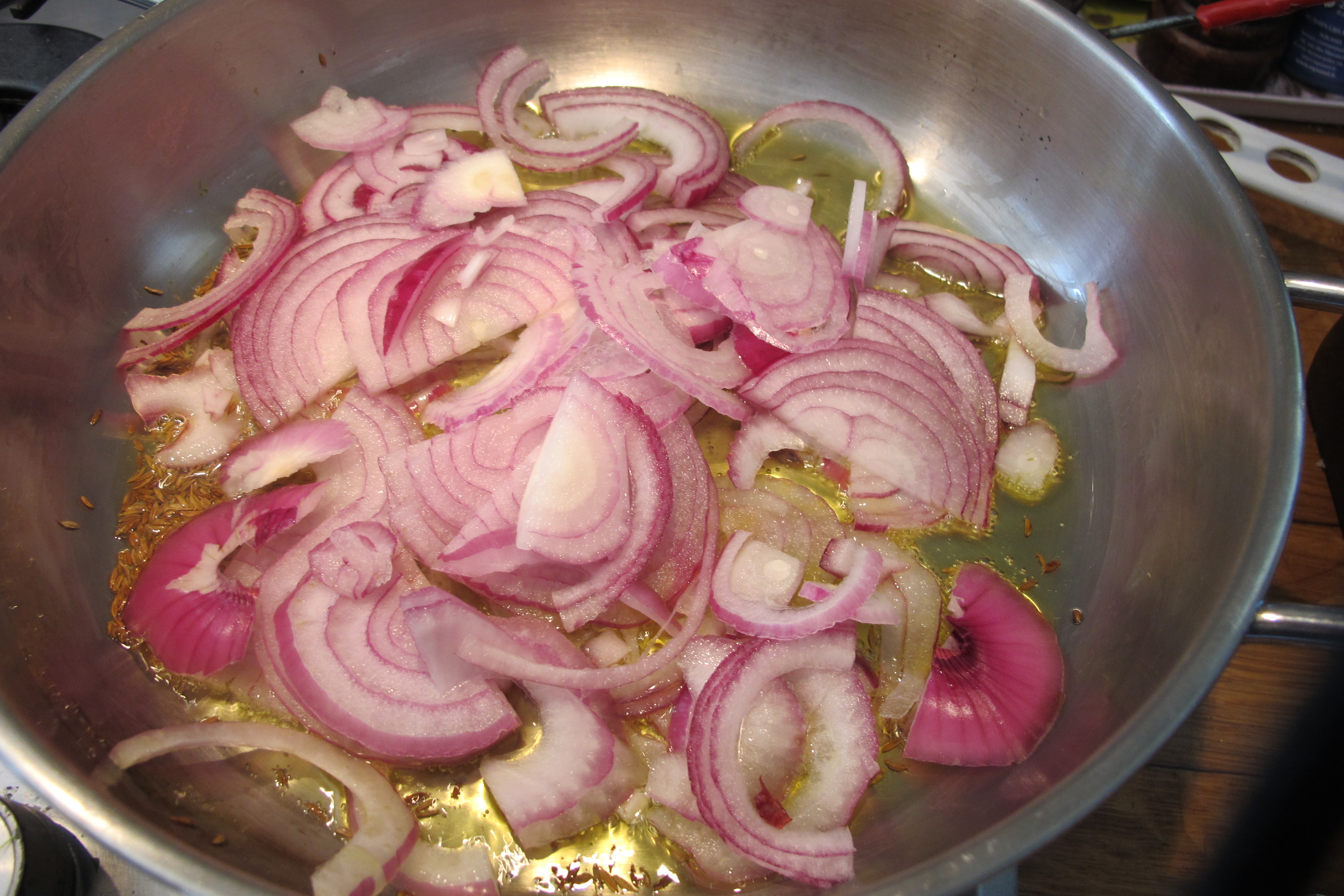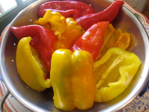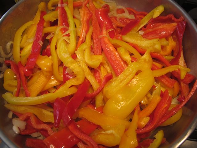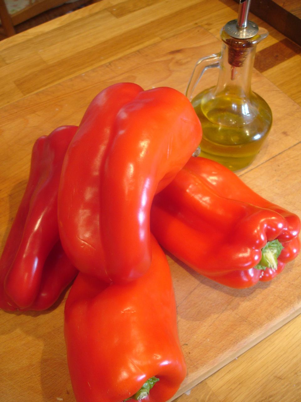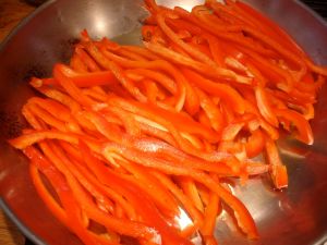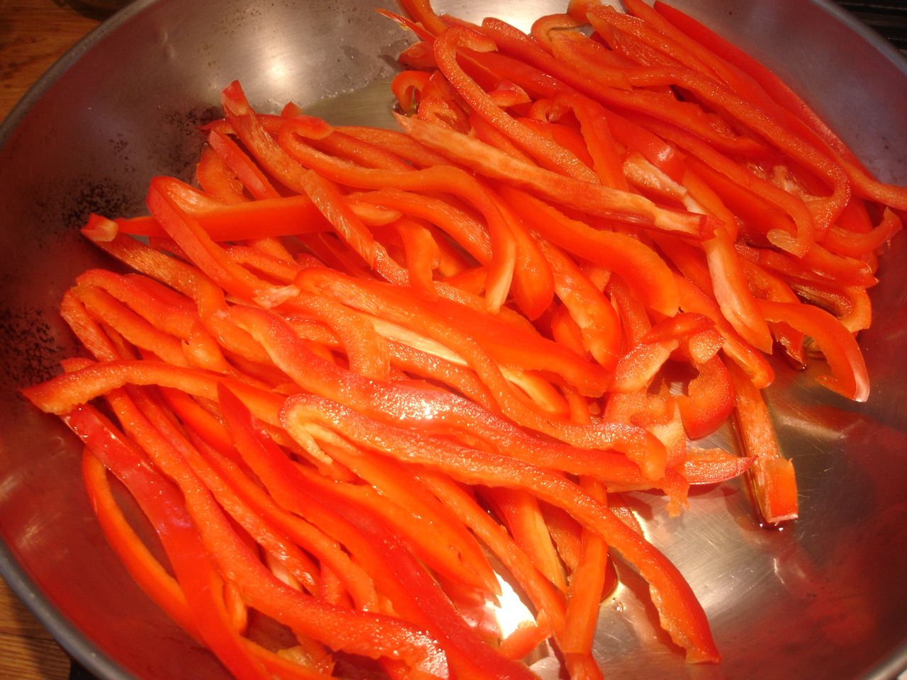 4 red peppers— cored, de-seeded and sliced fine lengthwise.