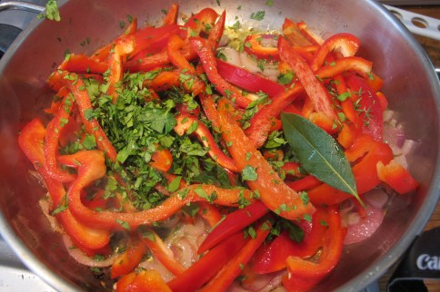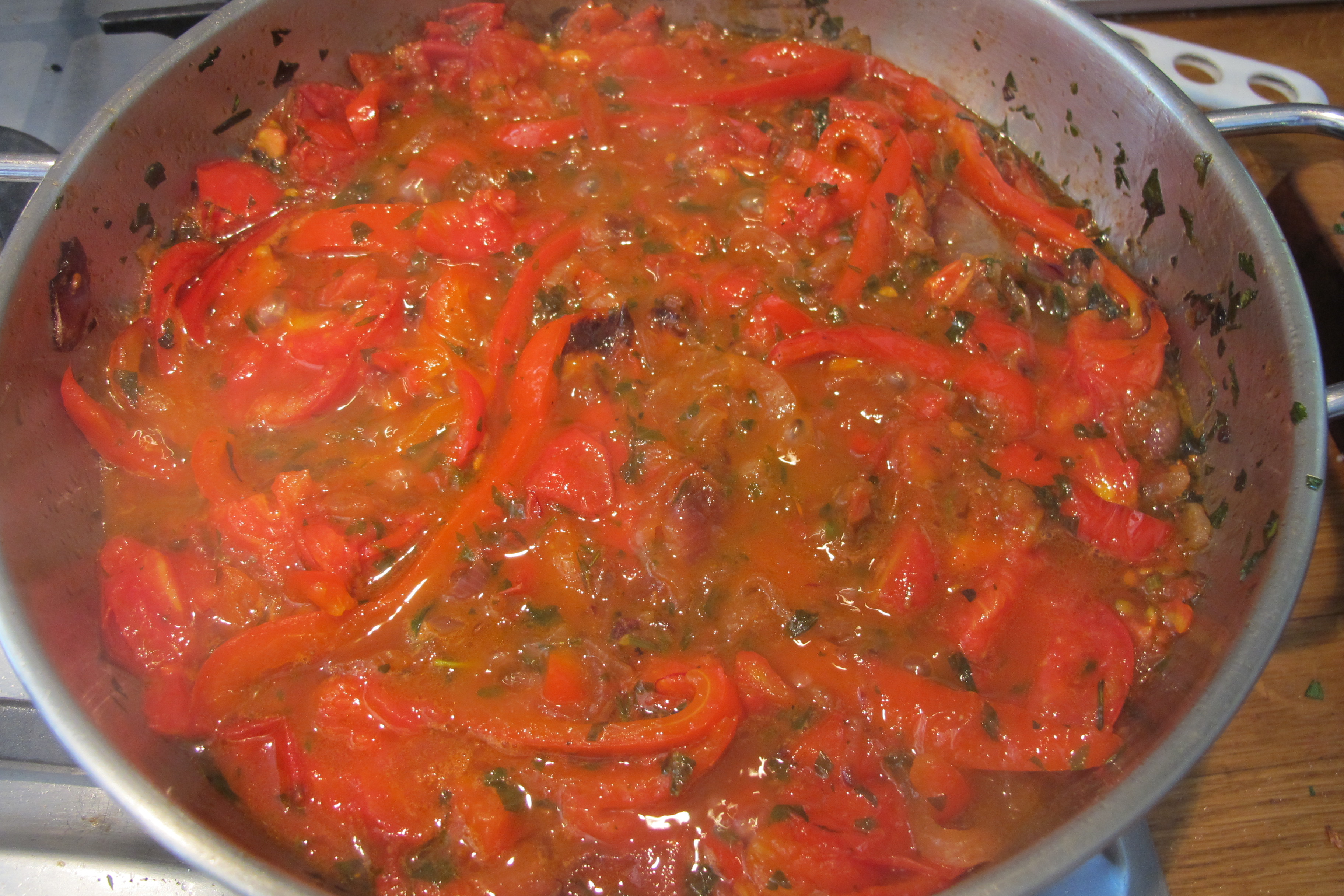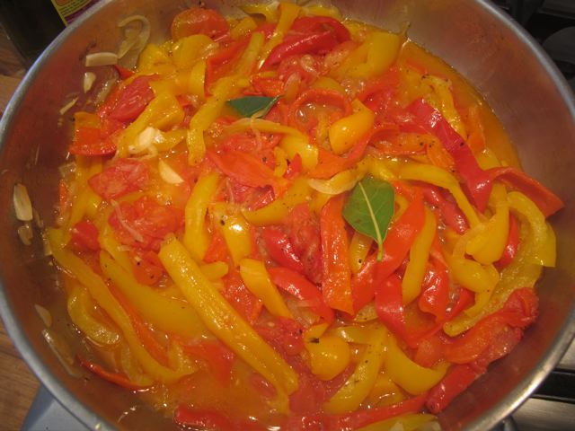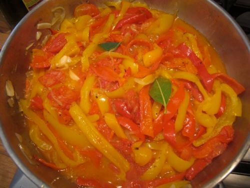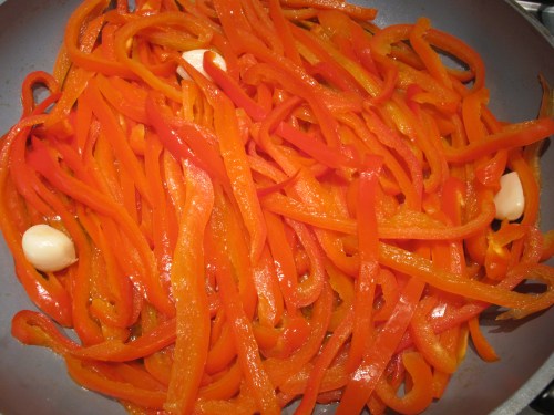 - In a large pan over a low heat gently soften the peppers with the garlic cloves in the olive oil; it’s worth taking the time to do this–undercooked peppers are as unpalatable as undercooked aubergines/eggplants.