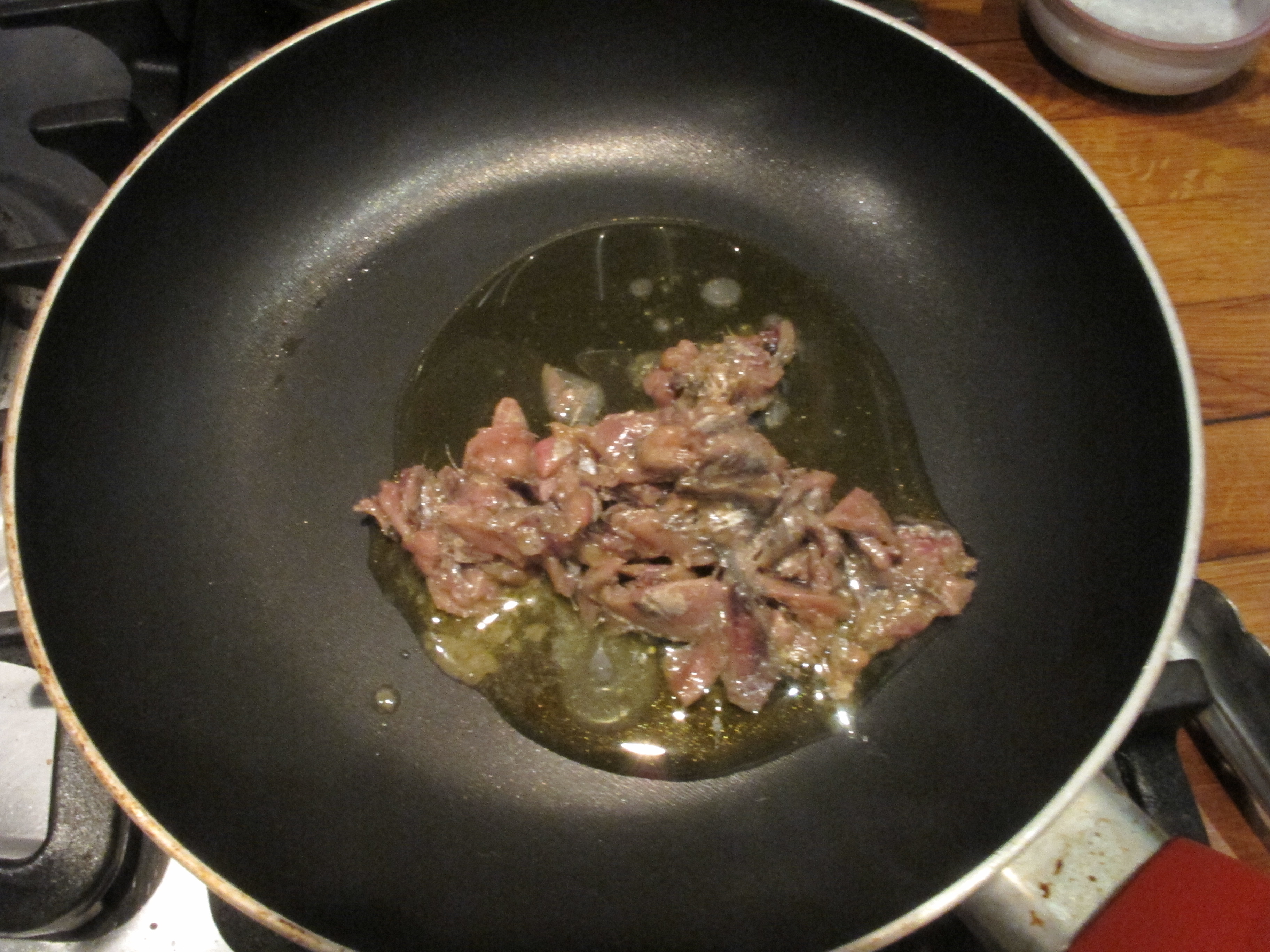 - In a small pan melt the anchovies slowly in a little olive oil by stirring and mashing them.