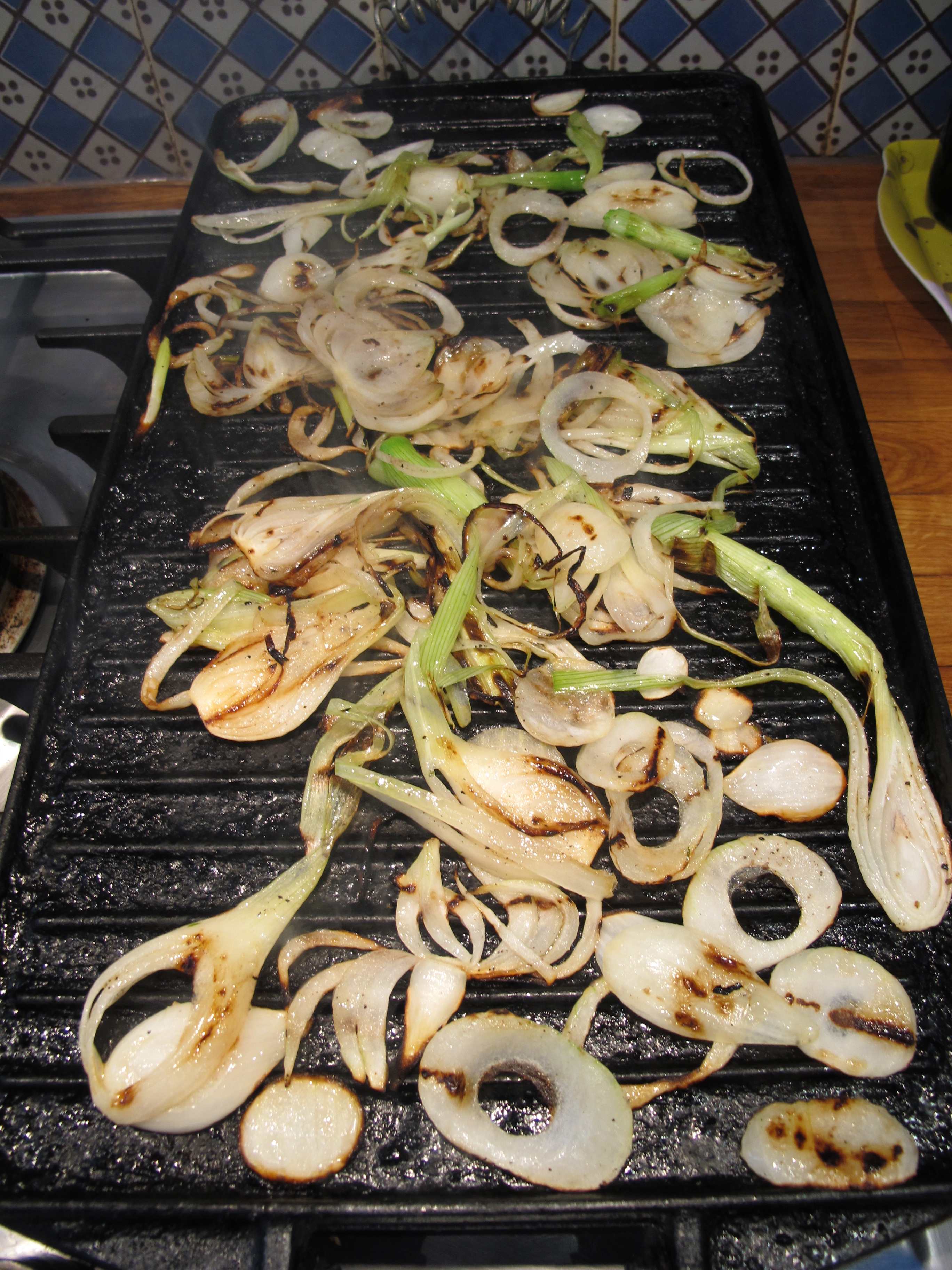 - When the pad is hot, tip the onions over it and spread them out evenly so they all get a chance to char a little.