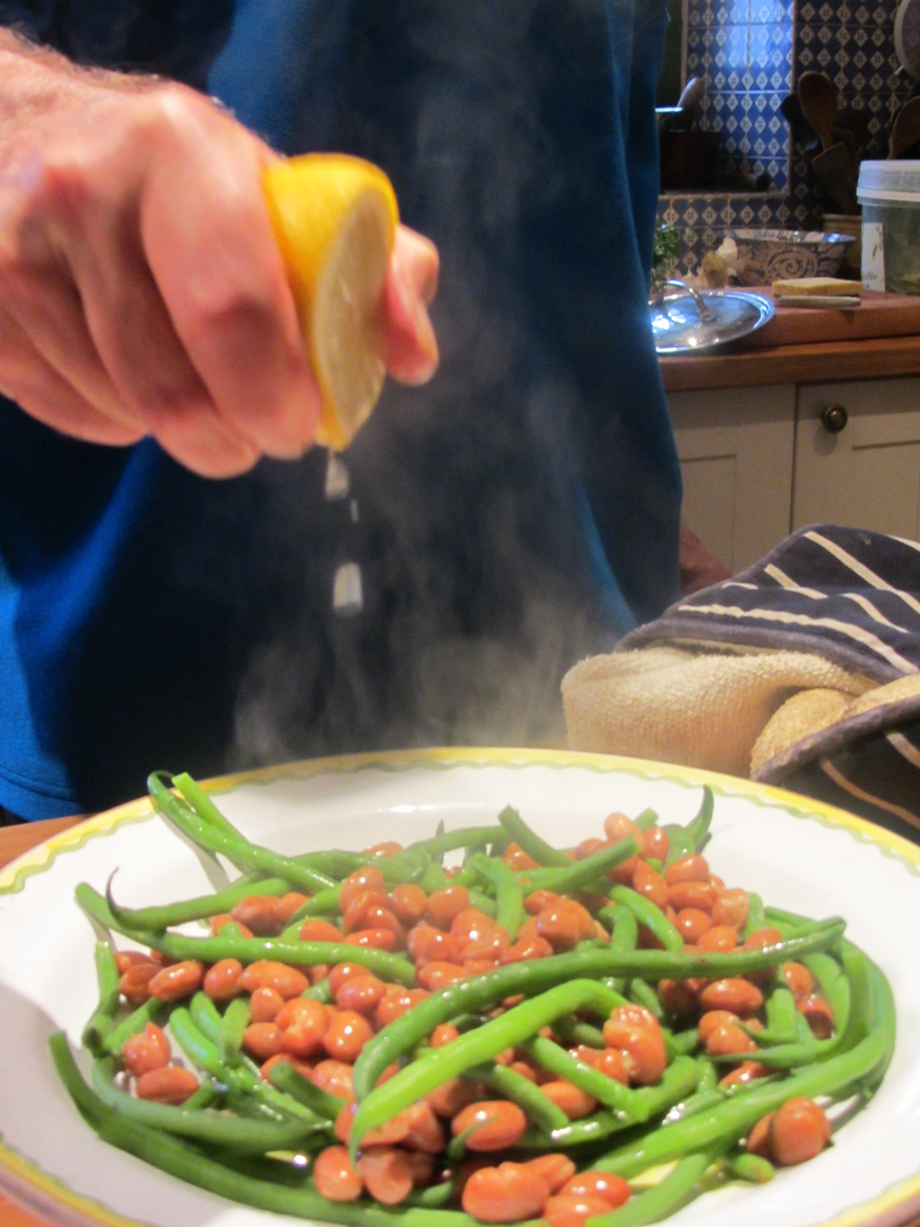 He uses butter and vermouth. I use olive oil and white wine–fits in better with my way of eating.