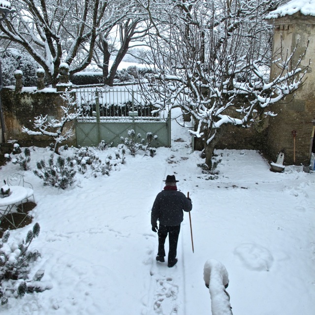 Climbing the slope towards the house forty minutes later I could tell that no car had passed since I’d left and looking back I saw my footprints had clearly made their mark in the deepening white.