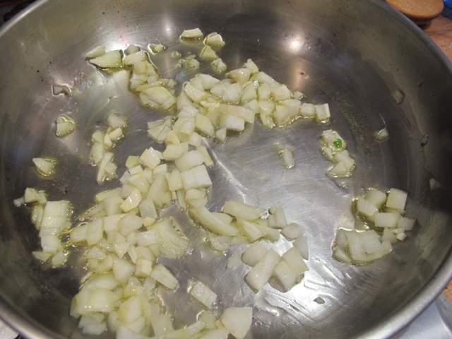 Heat a couple of tablespoons of olive oil in a sauté pan and add the onion and garlic.
