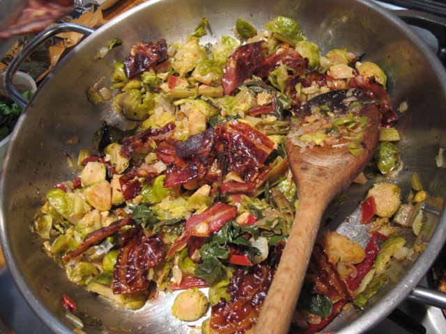 Well, bacon bits were already part of the feast on Christmas day–no harm in adding even more oven-crisped smoked bacon to the fried-up sprouts….