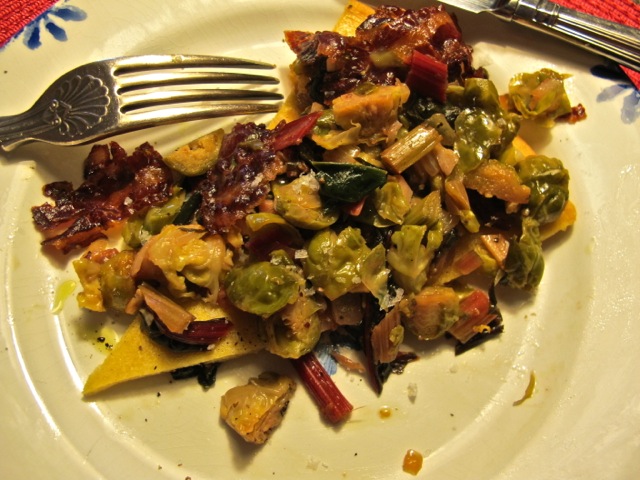 Let them color a little before adding the brussels and the swiss chard (or other leftovers).
